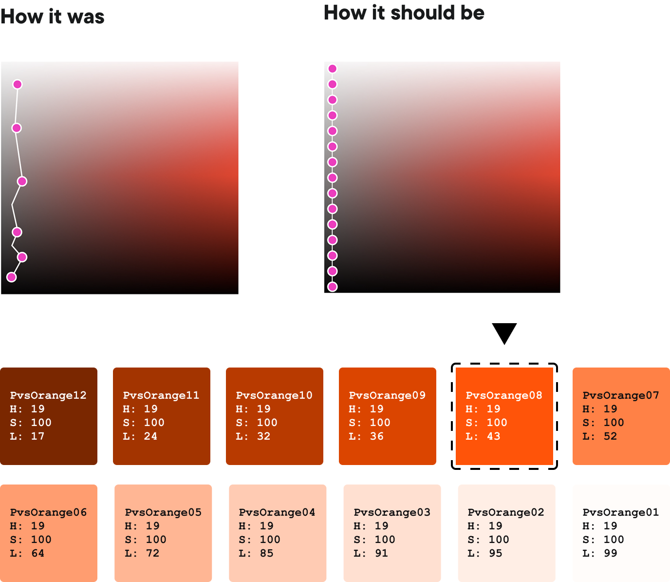 Our UI is anchored by the iconic pairing of Brand Orange and Greyscale. To ensure a consistent visual experience, we adopt the HSL (Hue, Saturation, Lightness) color model in our design process. Within our color library, the hue and saturation remain constant while variations in lightness create a dynamic range of tones.