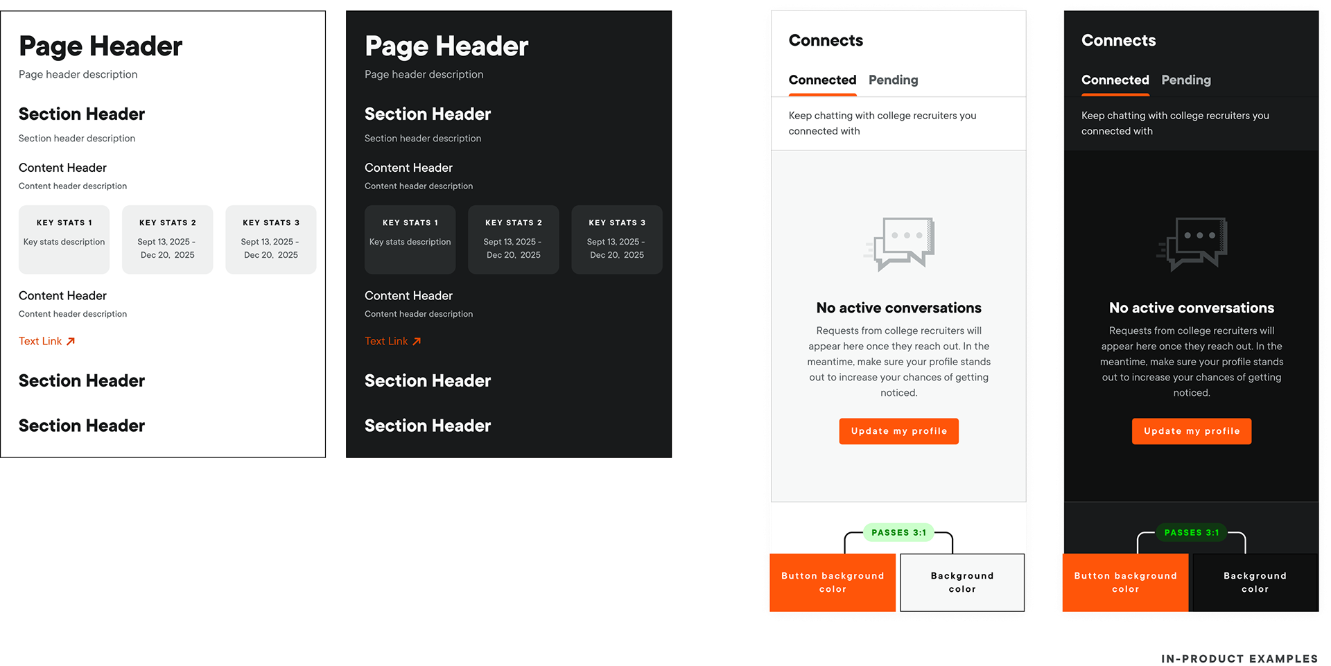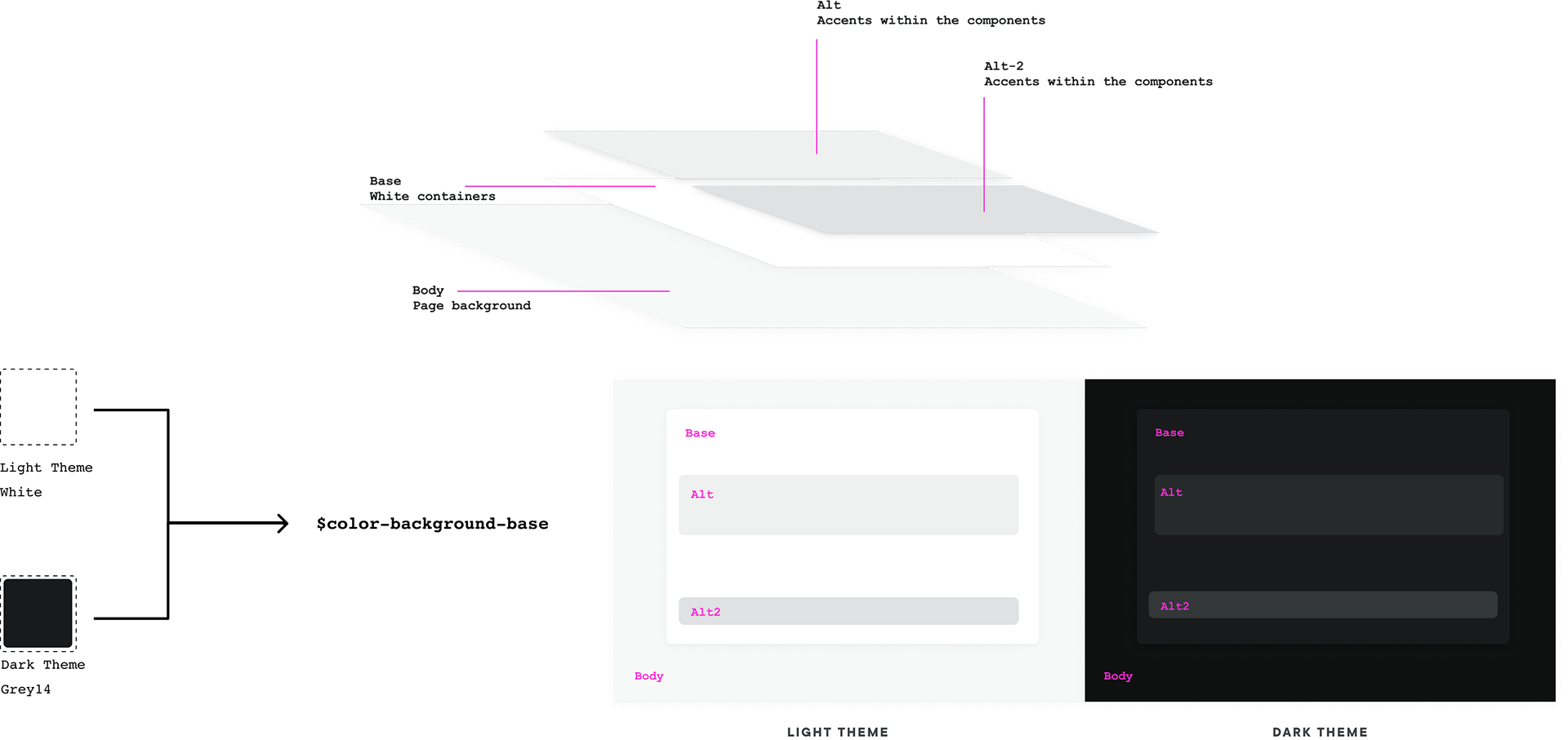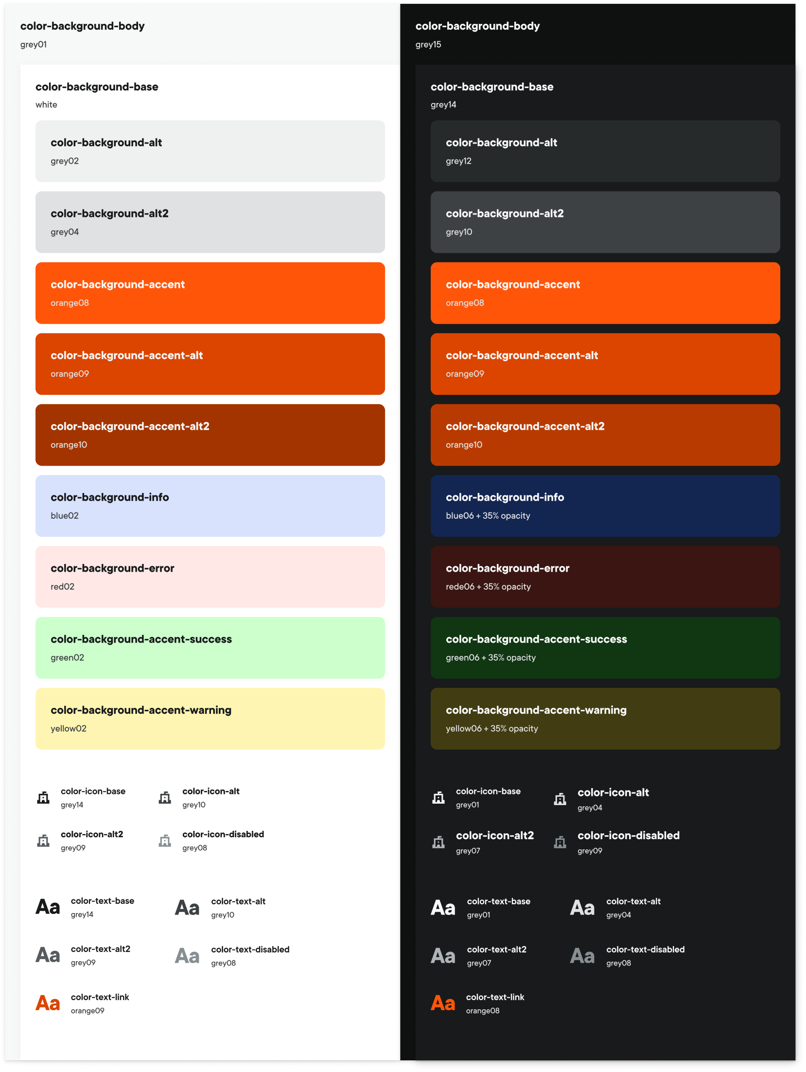 Color usage should convey a sense of visual and navigational hierarchy. Using color to segment your layout and UX into sections or draw user’s eye to a specific task. This theming approach is utilizing tokens that are designed to maintain color hierarchy. Following this logic we can ensure consistency and accessibility in our designs.