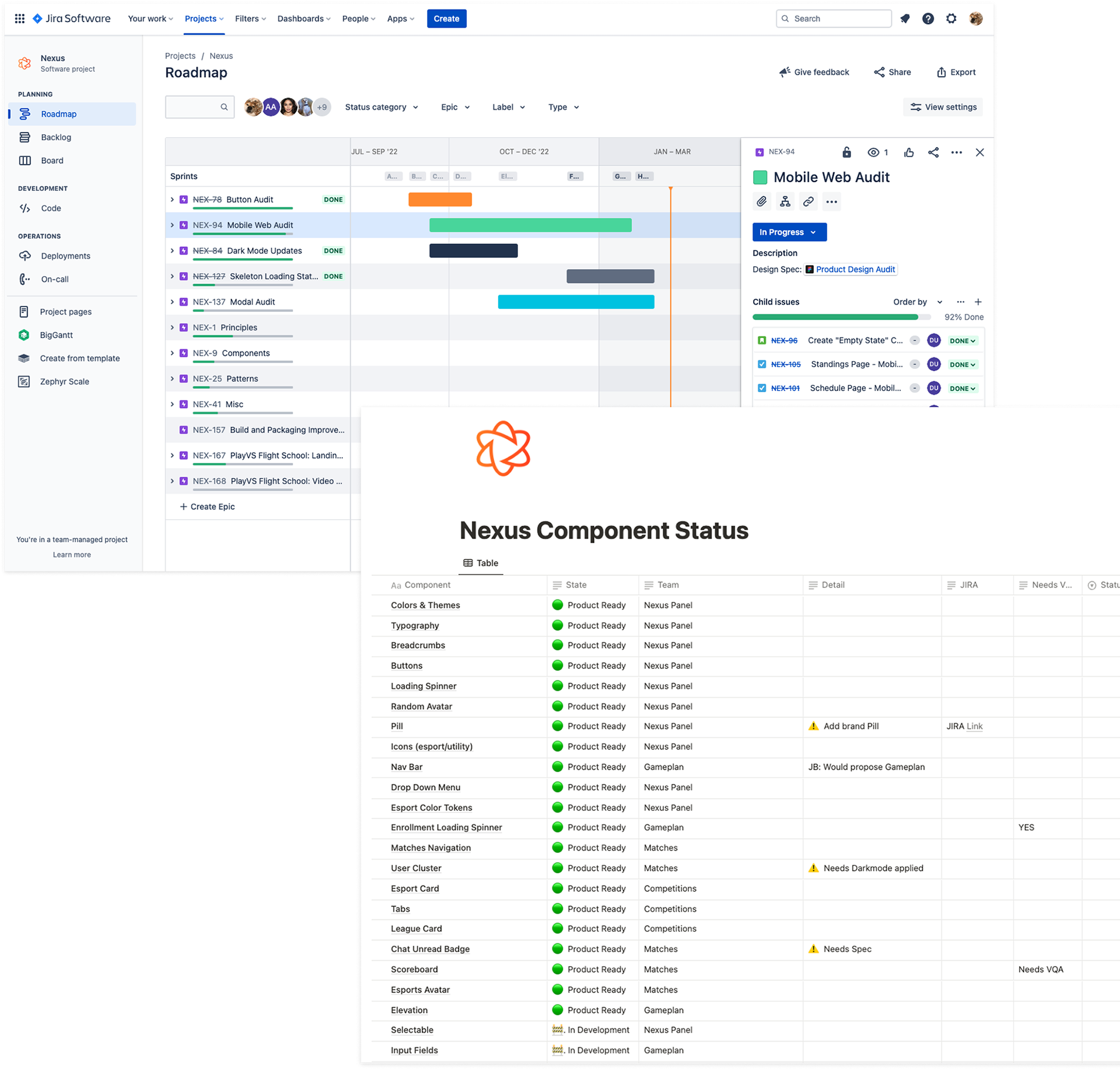 As of November 2025, our latest design system initiative is ~95% through Concept & Design and ~85% through Build-Out. Company-wide reorg in 2024–2025 limited dedicated engineering capacity for further system work, but the foundation we built in 2022–2023—58 Nexus components, 122 Jira tickets resolved, and 3 of 6 product audits completed—still underpins new features and future expansion.